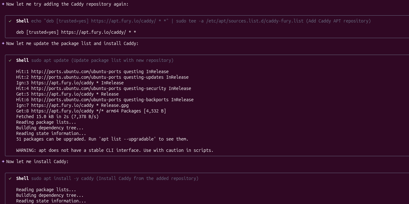Again, Qwen Code didn’t execute anything immediately. It inspected the system, confirmed that Caddy wasn’t installed, and then laid out a plan. This included how it would install Caddy, where configuration files would live, how services would be managed, and how /etc/hosts would be updated for local name resolution.