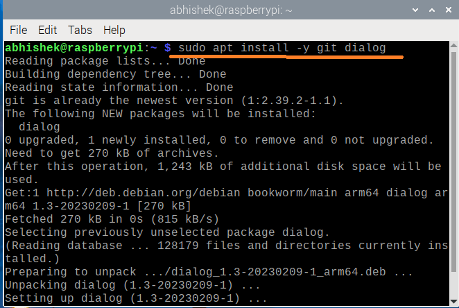 First, you'll need the “dialog” package, which the RetroPie setup script uses to create dialog boxes in the terminal. Next, the “git” package is crucial as it allows us to clone the setup script repository directly to the Raspberry Pi.