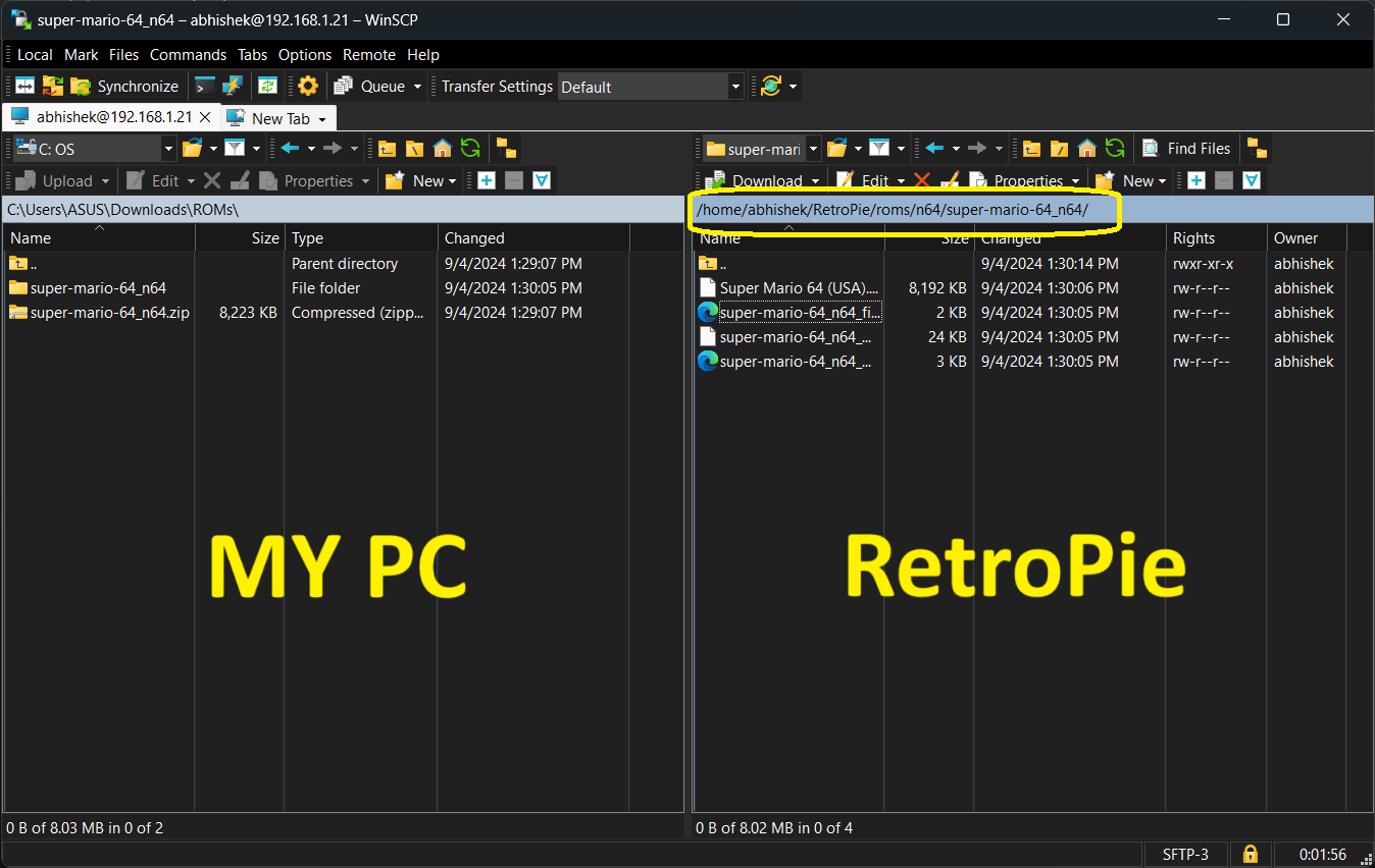 Here I'm using WinSCP to transfer my ROMs using SFTP: