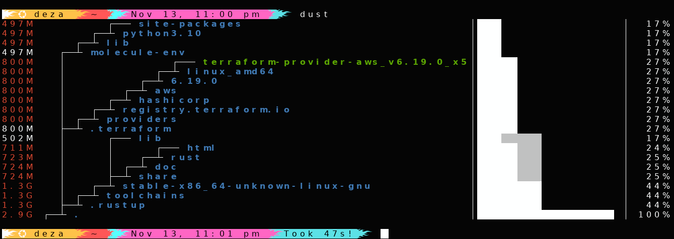du always dumps a mountain of numbers on your screen. dust turns that into a compact, visual representation of disk usage that you can parse at a glance.