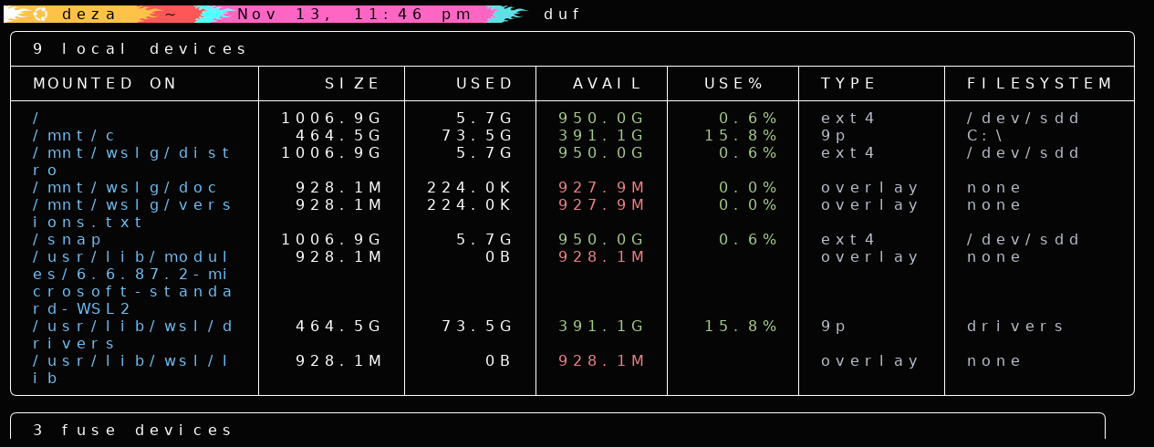 duf gives you a clean dashboard with grouped filesystems, readable sizes, clear partition labels, and a quick view of what’s healthy vs. what’s nearly full.