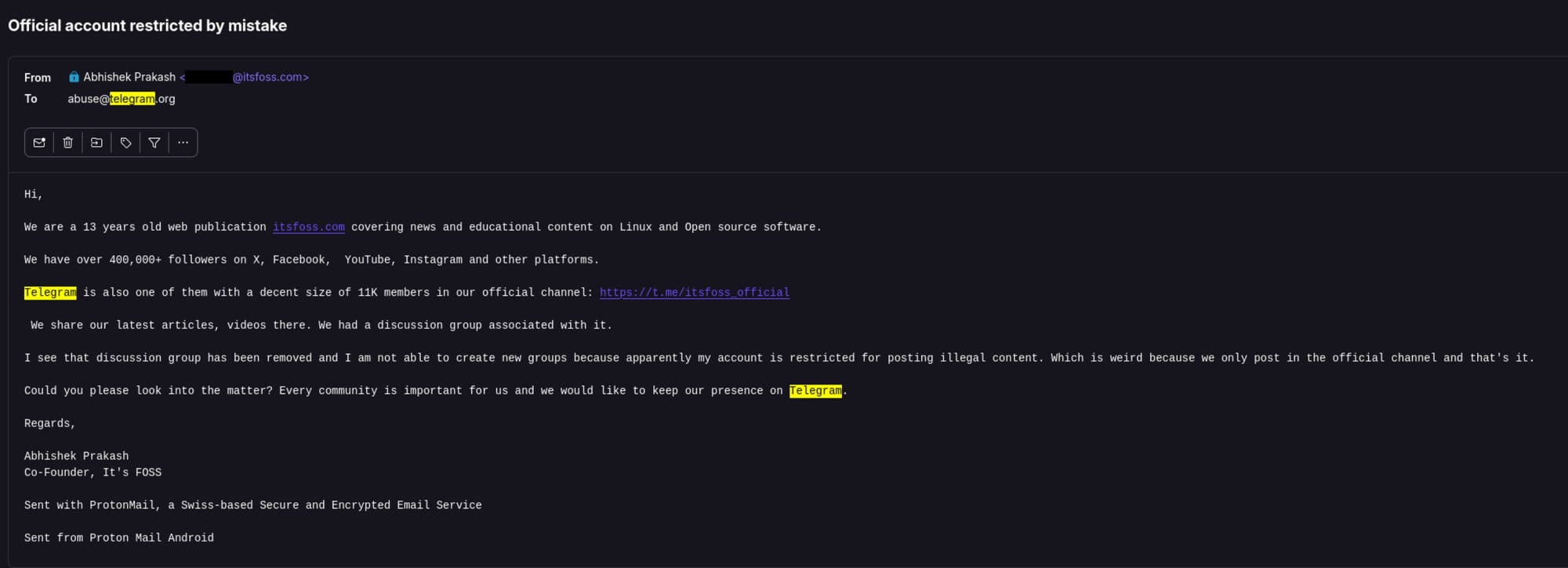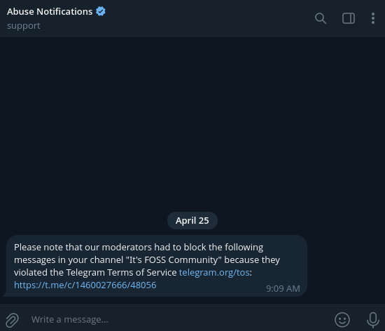 We contacted Telegram regarding this, bringing up the issue and highlighting how we, It's FOSS, are a trusted name in the Linux and open source space, but as of October 14, 2025, there has been no reply from their side.