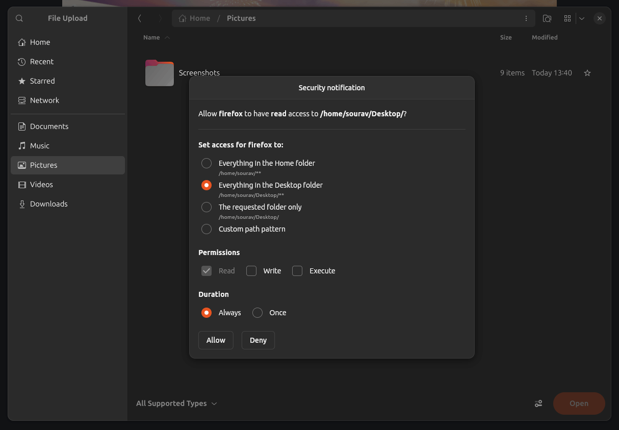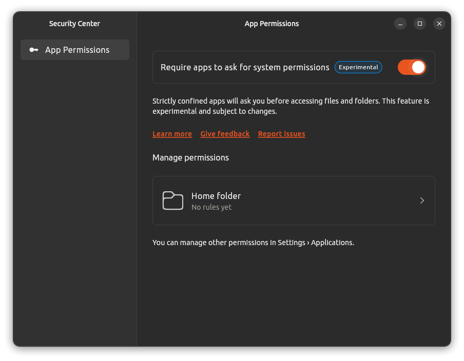 Currently, it only has the experimental App Permissions security setting, which can be enabled for Snap apps. As you can see above, after I enabled it, a security notification popped up, asking for permission before I could upload files to a website using Firefox (snap).